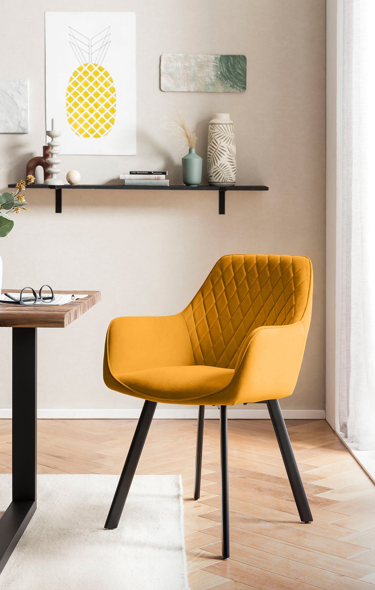 Massivholzmöbel aus Akazienholz gehören zu den zeitlos schönen Möbeln, die niemals aus der Mode kommen. Auch bei dieser 5-teiligen Essgruppe überzeugt der Esstisch mit einer 35 mm starken Tischplatte aus massiver Akazie. Die raue Balken-Oberfläche wird dabei zum absoluten Hingucker. Besonderes Highlight: Das U-Gestell aus schwarz lackiertem Metall verleiht dem Tisch eine sehr gute Stabilität und ist das passende Gegenstück zur Tischplatte in warmem Naturton. Dieser Esszimmertisch ist mehr als nur ein Sitzplatz zum Essen. Holen Sie sich ein Stück Natur in die eigenen vier Wände. Die Stühle sind mit einem hochwertigen Stoffbezug in matter Samtoptik bezogen. Die sesselförmige Sitzschale ist an der Innenseite mit einer aufwändigen Rautensteppung versehen. Durch die ergonomisch abgerundeten Ecken und Kanten, die Armlehnen und die angenehme Rückenlehnhöhe erhalten Sie einen Sitzkomfort der Extraklasse. Achtung: Da es sich bei diesem Massivholztisch um ein Naturprodukt handelt, kann es zu Astlöchern oder unterschiedlichen Farbschmückungen kommen, welche jedoch keine Fehler darstellen, sondern den individuellen Charakter des Echtholzes unterstreichen.5-tlg. Essgruppe im modernen Design Stühle mit attraktivem Bezug in einer Samt matt Optik Extravagante Tischplatte mit rauer Balken-Oberfläche Plattenstärke 35 mm Akazie vollmassiv Rückenfläche mit aufwändiger Rautensteppung Material: Akazie, Samt (100% Polyester), Metall Farbe: Natur, Gelb, Schwarz Maße ca.: Esstisch Akazie, Esszimmerstuhl gelb bestehend aus 1x399026+2x372227 Maße des Tischs: B160xT90xH75 cm, Maße des Stuhls: B61xT68xH82 cm, Sitzhöhe ca. 46 cm, Sitzbreite ca. 41 cm, Sitztiefe ca. 42 cm, max. Belastung 120 KG, Höhe der Armlehnen ca. 63 cm, Höhe Rückenlehne ca. 33,5 cm, Lichtbeständigkeit Bezug = 4, Pilling Bezug = 5, Abnutzungsresistenz = 60.000 Scheuertouren, Plattenstärke: 35 mm, Abstand zwischen den Beinen: ca. 103 cm, Tischplatte 2-fach lackiert Gewicht ca.: 75,6kg Die Lieferung erfolgt zerlegt mit ausführlicher Aufbauanleitung