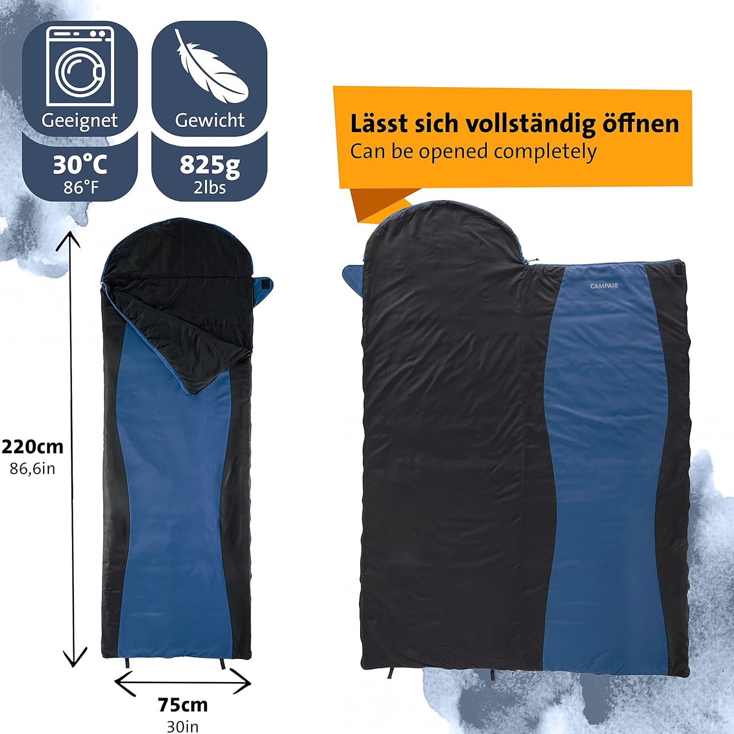 - Durch den 2-Wege-Rundum Reißverschluss ist der Schlafsack komplett aufklappbar und als Decke nutzbar