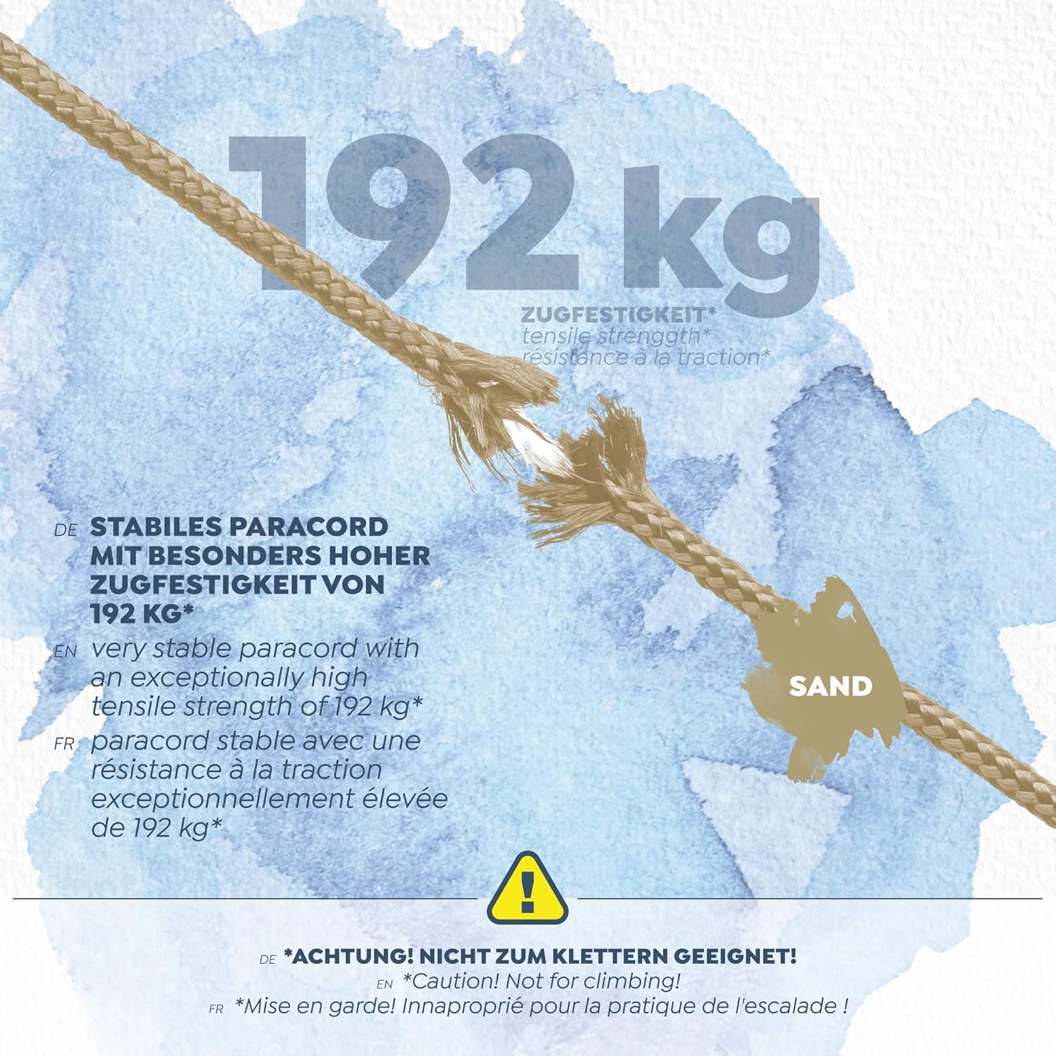 - Schnittflächen lassen sich ganz einfach mit einem Feuerzeug versiegeln, nicht als Kletterseil geeignet!
