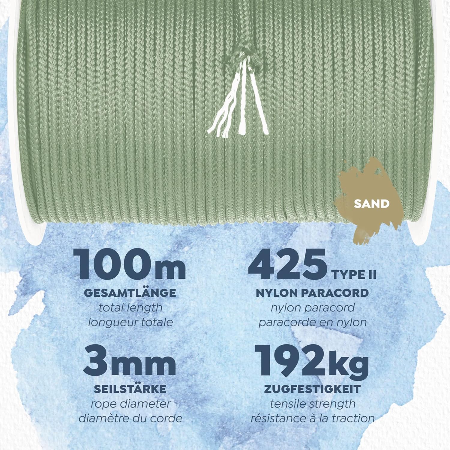 - 192kg (425 lbs) Bruchlast, 3mm Durchmesser & 100m Länge, 100% Nylon Paracord 425 Type II, Gewicht: 560g