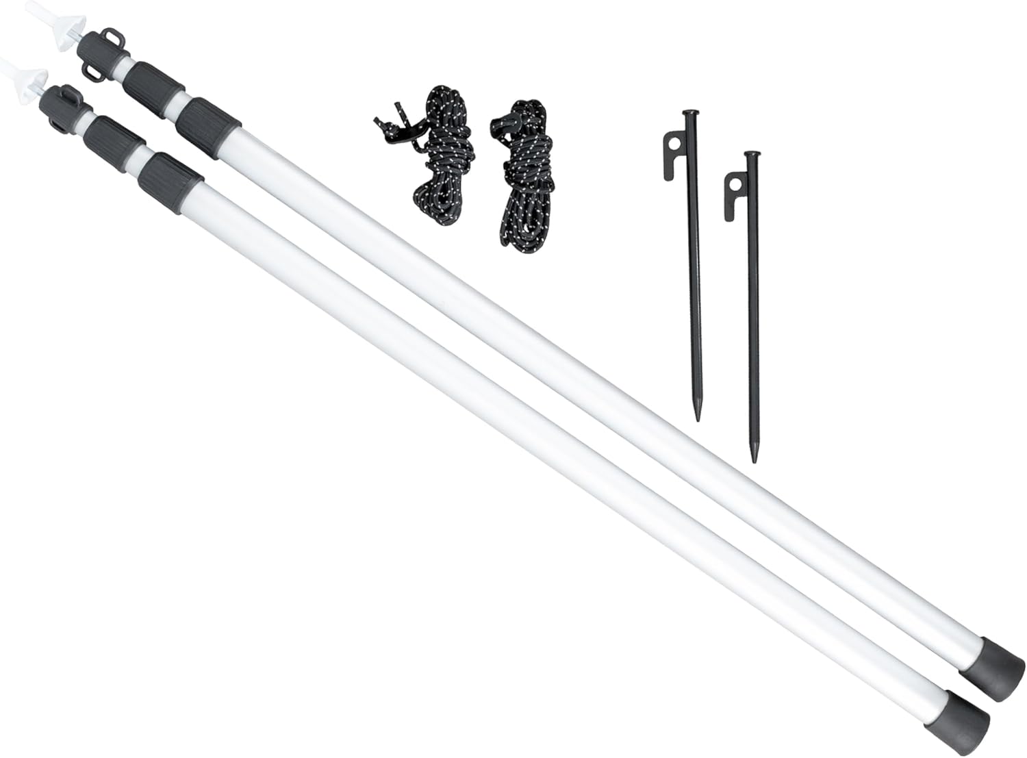Zwei Teleskopstangen, zwei Stahlheringe und zwei reflektierende Abspannleinen ermöglichen es Ihnen, die Fläche unter Ihrem Sonnenschutz mühelos zu erweitern. Selbstverständlich auch perfekt geeignet als Erweiterung für andere Tarps und Sonnensegel.