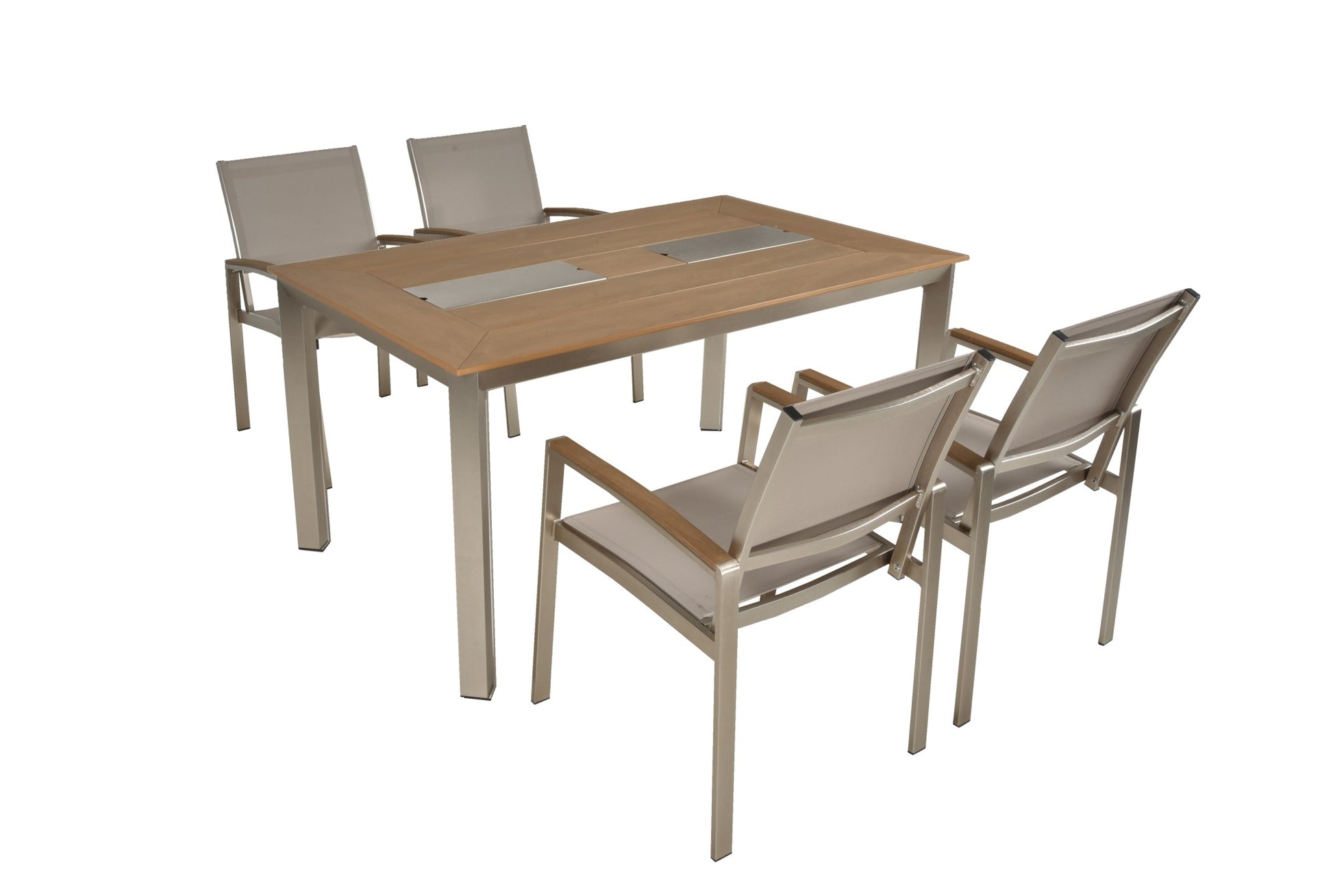 Die strapazierfähige Oberfläche der Tischplatte in Teak-Optik (Holzimitat auf Kunststoff-Basis) bilden einen schönen Kontrast zum champagnerfarbenen Aluminium-4-Fuß-Gestell.