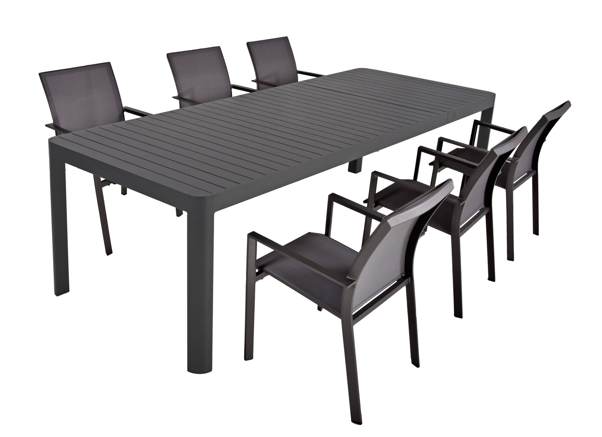 Hersteller: Garden Pleasure Farbe: Grau Materialart: Aluminium pulverbeschichtet Kunststoff Serie: Amira Maße je Stuhl ca.: 56×63×89cm Maße Tisch ca.: 240/195x75x100cm, Belastbarkeit ca. 60kg Gesamtgewicht kg ca.: 66,8 Herstellungsland: China