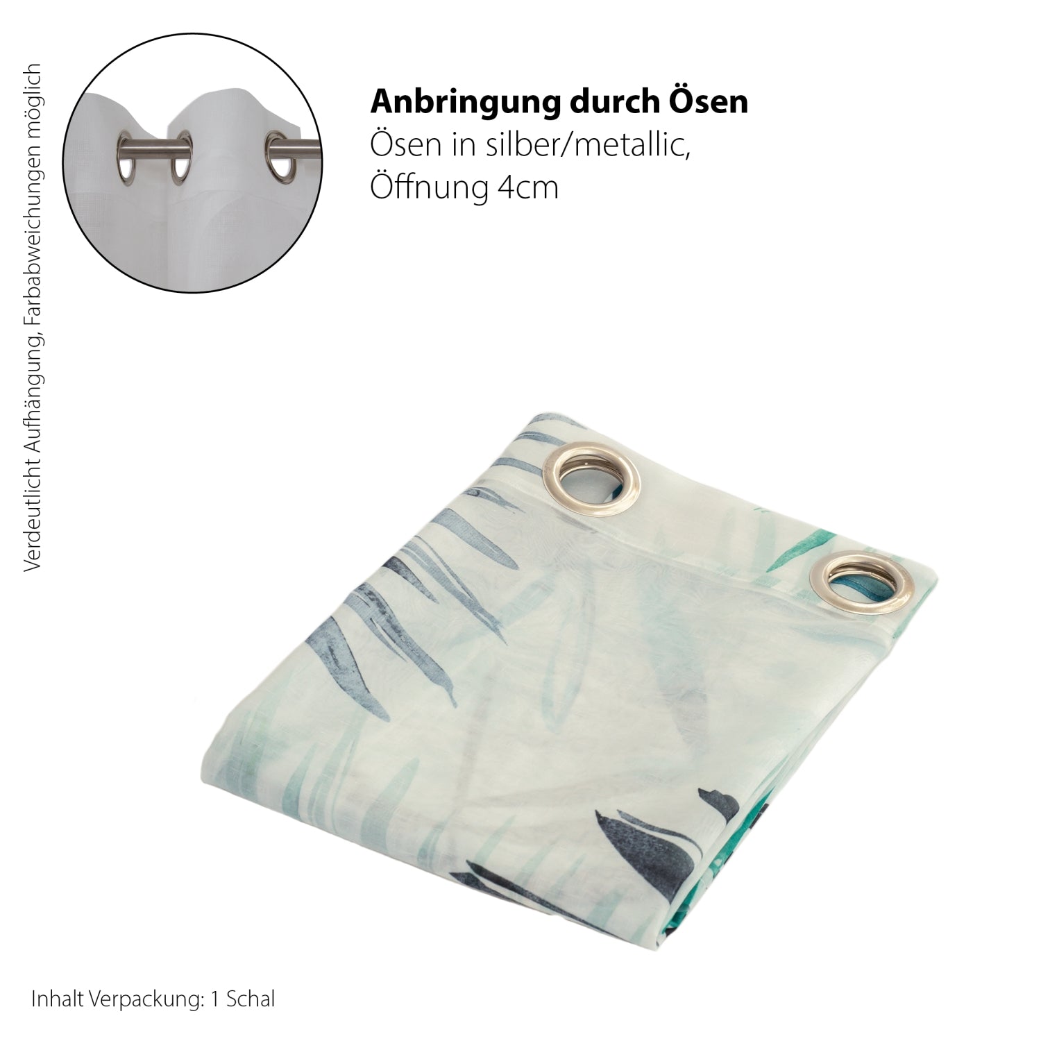 Ösenschal Jane 140x245cmMarke: Homing Kollektion: Jane Artikelnummer: 5470-05 Muster: Geblümt Material: 100% Polyester Aufhängung: Ösen Größe ca.: 140x245cm Farbe: grün-petrol Optik: Durchscheinend Pflege: Maschinenwäsche Gewicht in kg ca.: 0,3