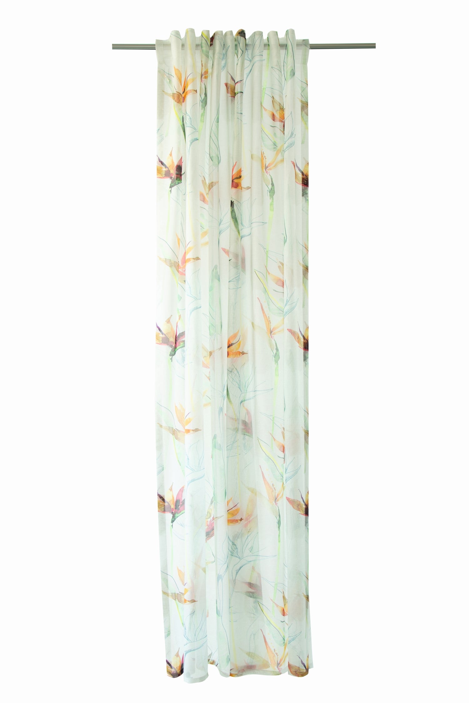Direkt aus dem Jungel inspiriert, ziert das farbenfrohe Blütendesign die transparente Gardine Lycka. Der Vorhang mit verdeckter Schlaufe bringt den Dschungeltrend in jeden Raum.