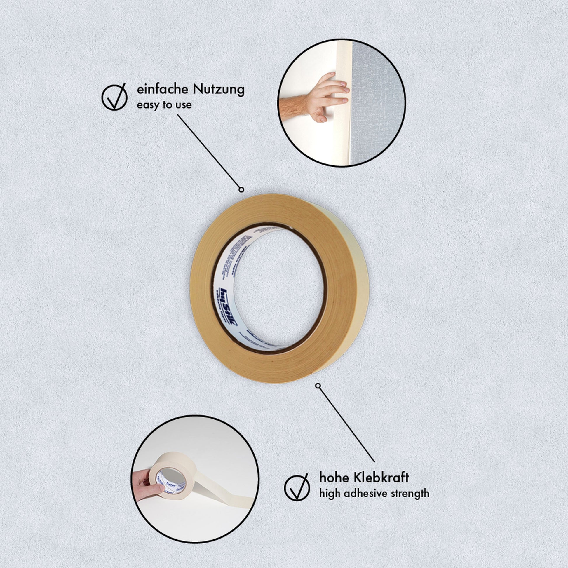 - das hochwertige Flachkreppband hält bis zu 14 Tage auf glatten Untergründen im Innenbereich