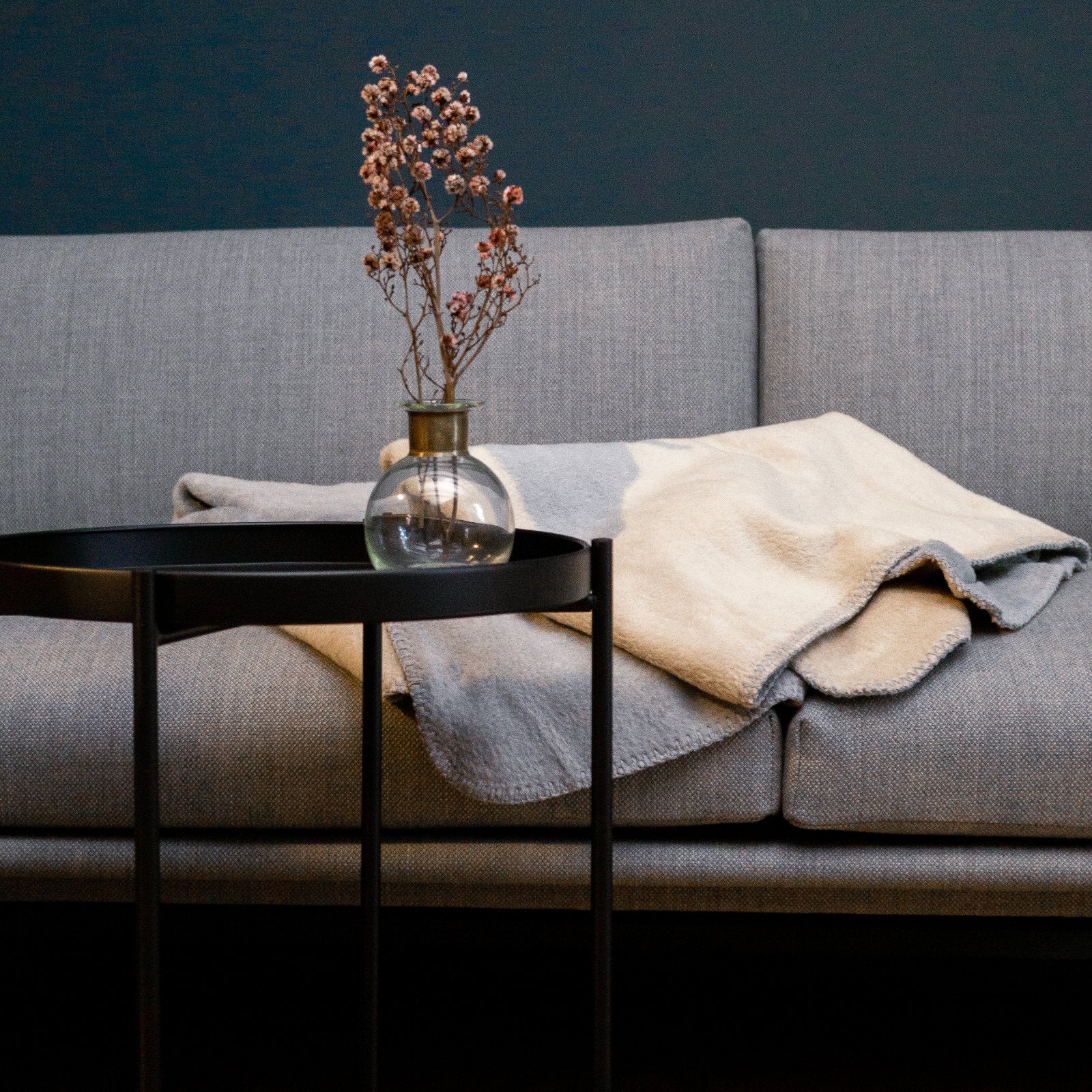 Das besondere Highlight der Decke ist das Kuh-Motiv — eine stilisierte Kuh-Silhouette in Beige, die sich harmonisch vom grauen Hintergrund abhebt. Dieses charmante, ländlich inspirierte Design verleiht der Decke eine rustikale und dennoch moderne Note. Die Rückseite der Decke ist ebenfalls beige, sodass sie je nach Stimmung gewendet werden kann.