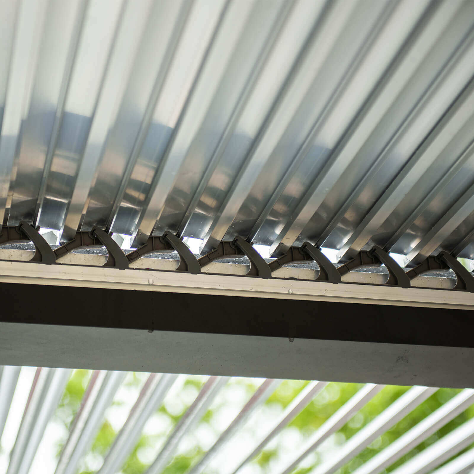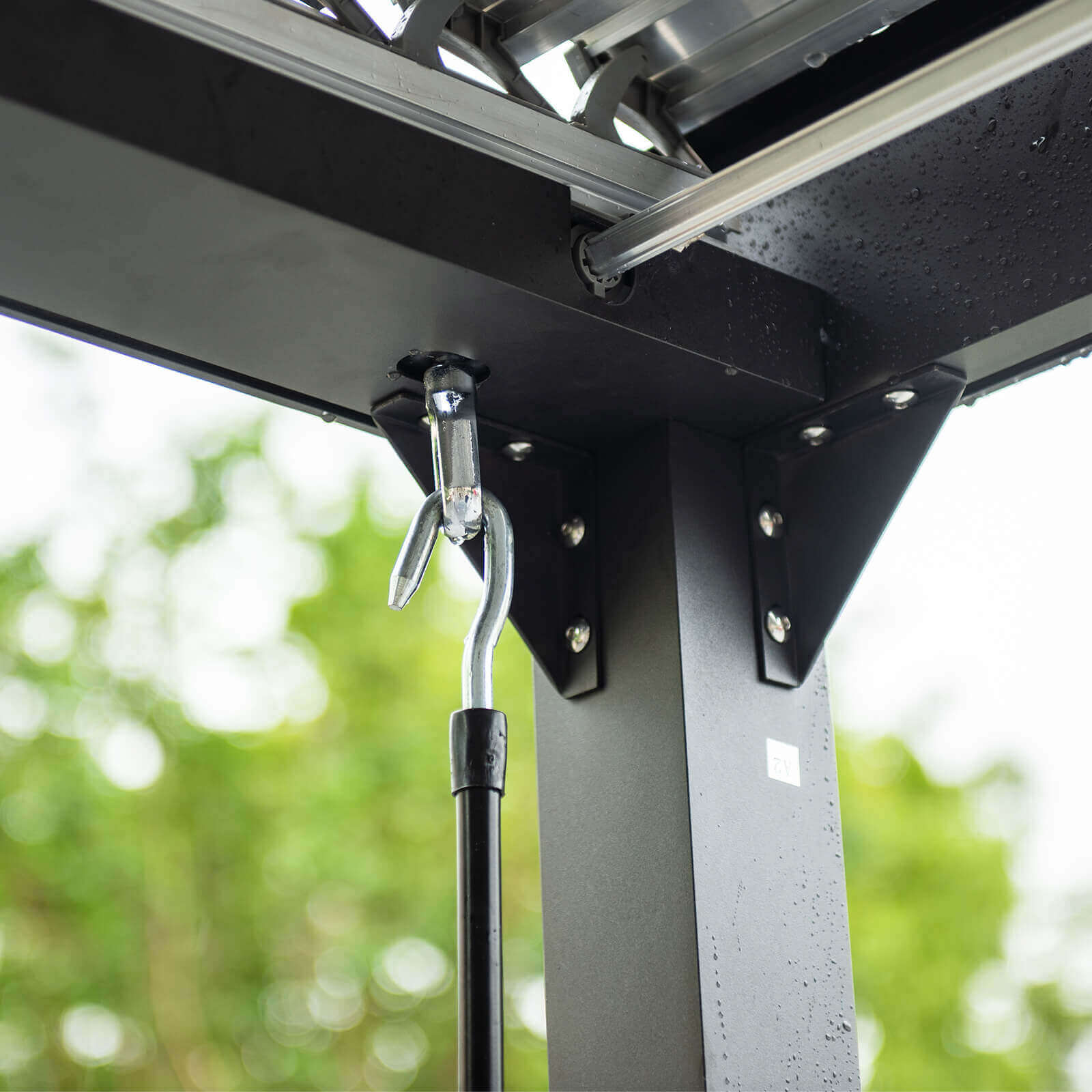 Das stabile Gestell aus pulverbeschichtetem Aluminium ist besonders witterungs- und korrosionsbeständig. Mit einer Materialstärke von 2 mm beim Gestell und 1,12 mm bei den Lamellen überzeugt der Pavillon durch Langlebigkeit und Standfestigkeit. Die integrierte Regenrinne sorgt dafür, dass Regenwasser kontrolliert über die Pfosten abgeleitet wird – clever und zuverlässig.