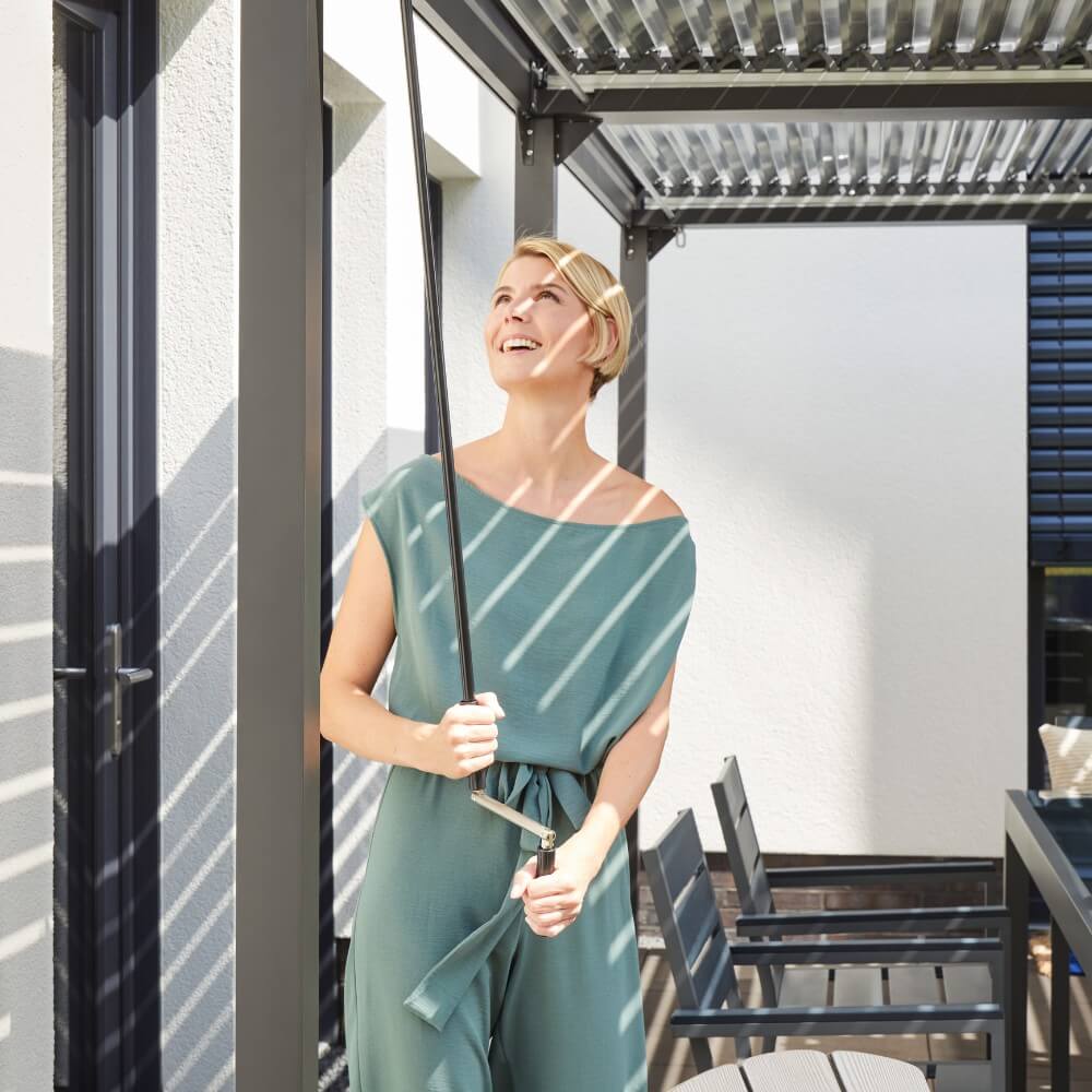 Dank der flexibel verstellbaren Aluminiumlamellen passt du den Lichteinfall und die Luftzirkulation jederzeit deinen Bedürfnissen an. Per praktischer Handkurbel kannst du das Dach bequem öffnen oder schließen – so bleibst du flexibel bei Sonne, Wind oder leichtem Regen.