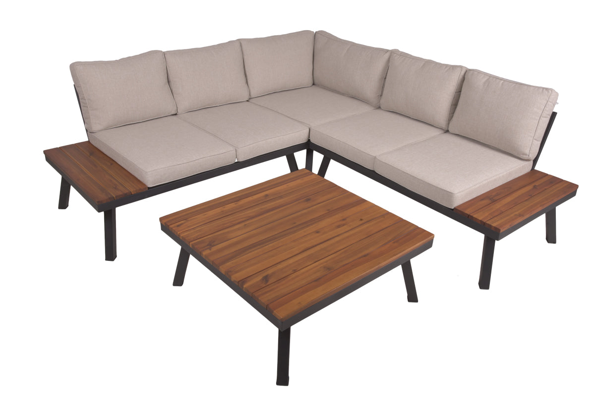 Die Lounge-Eckgruppe THERESA ist die perfekte Ergänzung für jeden Outdoorbereich. Mit ihrem schwarzen Stahlgestell und den Sitzflächen aus Akazienholz bietet sie nicht nur eine moderne Optik, sondern auch eine hohe Langlebigkeit.Das Gestell ist stabil und robust, wodurch die Lounge-Gruppe auch bei häufigem Gebrauch lange Freude bereitet. Die Sitzauflagen und Kissen in der Farbe beige sind waschbar, runden das Gesamtbild ab und sorgen für angenehmen Sitzkomfort.Ob für den Garten, den Balkon oder die Terrasse, die Lounge-Gruppe THERESA ist ein echter Hingucker und bietet einen Ort der Entspannung für die ganze Familie.Da es sich bei Akazienholz um ein Naturprodukt handelt, kann es zu Astlöchern, leichten Trockenrissen oder verschiedenen Farbausschmückungen kommen, welche jedoch keine Fehler darstellen. Der individuelle Charakter des Echtholzes wird dadurch unterstrichen. Alle diese Feinheiten machen jedes Möbelstück zu einem individuellen und einzigartigen Unikat.Wir weisen darauf hin das Akazienholz ist ein Naturprodukt ist, welches auf Witterungsverhältnisse reagiert. Wir empfehlen aus diesem Grund einen möglichst geschützten Aufstellungsort für eine langfristige Nutzungsdauer. Pflegen Sie die Bank jährlich mit einem handelsüblichen Holzöl. Reinigen Sie hierzu die Flächen mit einem weichen Handfeger und entfernen Sie Verschmutzungen einem leicht feuchten Tuch.Das Holzöl tragen Sie mit einem weichen Pinsel dünn auf. Nach einer Trockenzeit (nur wenige Stunden an warmen Tagen) entfernen Sie überschüssiges Öl mit einen trockenen Lappen. Die Bank kann je nach Witterung nach ein bis zwei Tagen wieder genutzt werden.