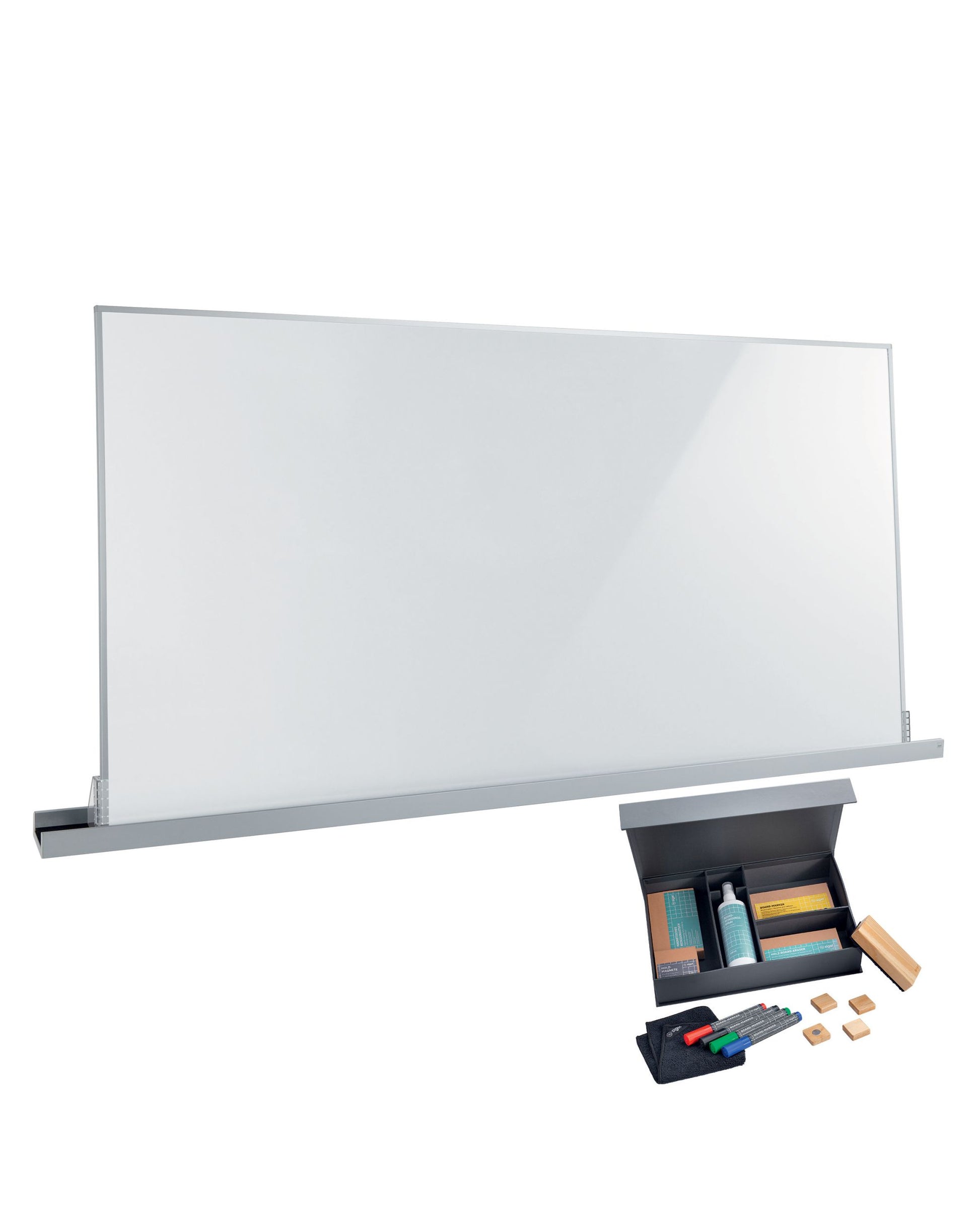 Meet up-Set enthält: Ein Whiteboard mit beschichteter Metalloberfläche und hochwertigem Aluminium-Rahmen in der Größe 90 x 180 cm. Das Board ist in der Meet up-Wandschiene im Querformat nutzbar. Außerdem gibt es ein Starterset mit vier farbintensiven, dennoch leicht abwischbaren Board-Markern, vier formschönen Holz-Magneten, einem nachhaltigen Holz-Board-Eraser inkl. Ersatzpad und einem Reinigungsspray mit magnetischen Reinigungstuch. Das Zubehör wird in einer anthrazit-farbenen Kartonbox mit praktischer Innenaufteilung und Tragegriff verstaut.