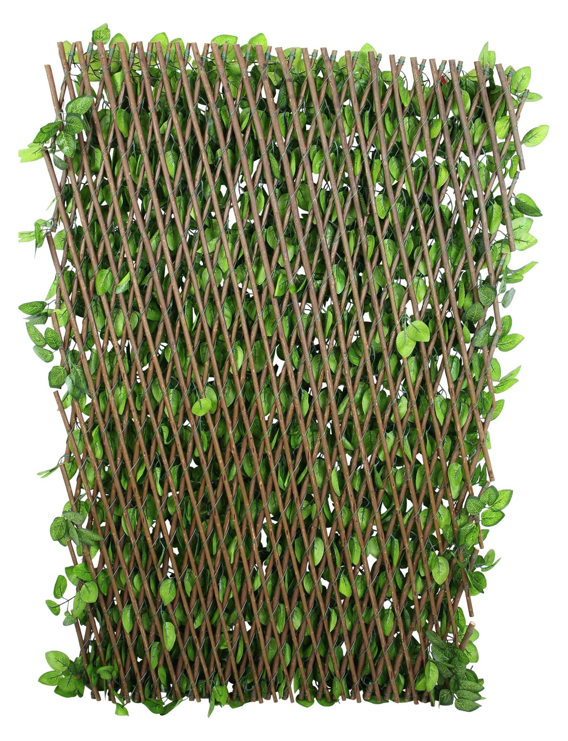 Der Sichtschutz mit Blättern ist nicht nur ein funktionaler Zaun für Ihren Garten oder Ihre Terrasse, sondern auch eine attraktive Möglichkeit, Privatsphäre zu schaffen und Ihre Außenbereiche zu verschönern. Diese variable Pflanzenwand besteht aus einem Weidenzaun, der mit Kunstpflanzen (Blättern) verziert ist und bietet eine flexible Lösung für Ihren individuellen Bedarf. Mit Maßen von 200 x 100 cm und einer Maschenweite von 7 x 7 cm bietet dieser Sichtschutz ausreichend Fläche, um einen Bereich abzutrennen oder zu verschönern. Die Weidenzaunstruktur verleiht ihm einen natürlichen und rustikalen Charme, während die Kunstpflanzen einen üppigen Grünschleier schaffen, der für Privatsphäre und visuelle Attraktivität sorgt. Das Besondere an dieser Pflanzenwand ist ihre Flexibilität: Sie kann wie eine Ziehharmonika auseinandergezogen werden, um die Abtrennung je nach Bedarf höher oder niedriger, dichter oder luftiger zu gestalten. Dadurch können Sie die Wand ganz nach Ihren individuellen Vorlieben und Anforderungen anpassen und Ihren Außenbereich perfekt gestalten.